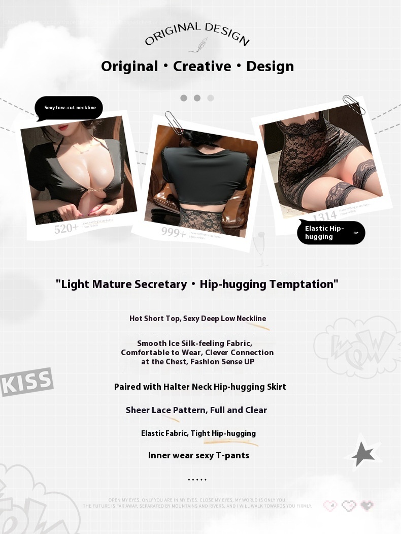 Manyan sexy lingerie women’s sexy hanging neck, low cut hollow lace hip skirt, secretary’s sleeping dress set 100150