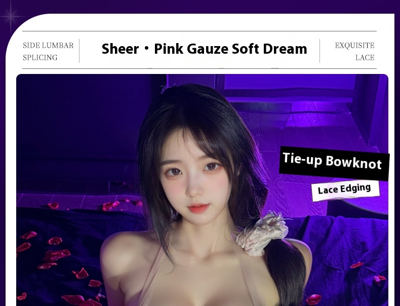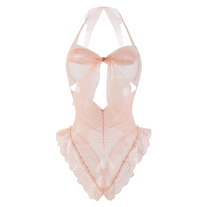 Manyan sexy lingerie women’s sexy pleated neck tight jumpsuit bow lace uniform 100669