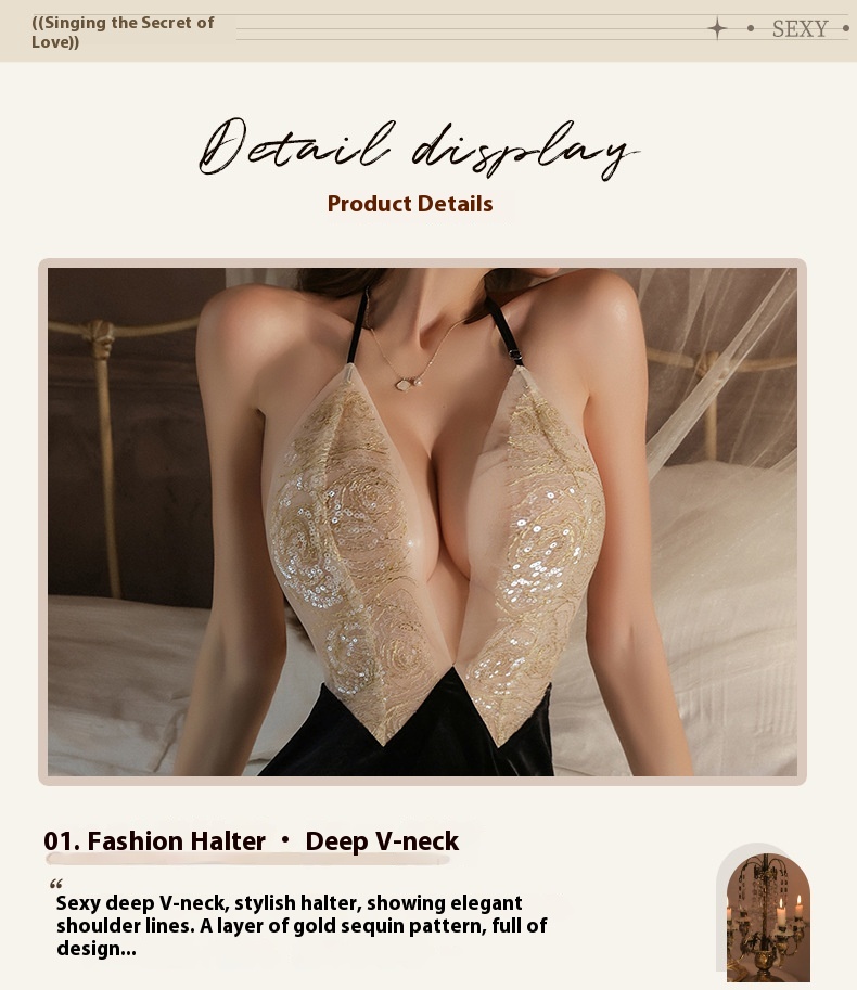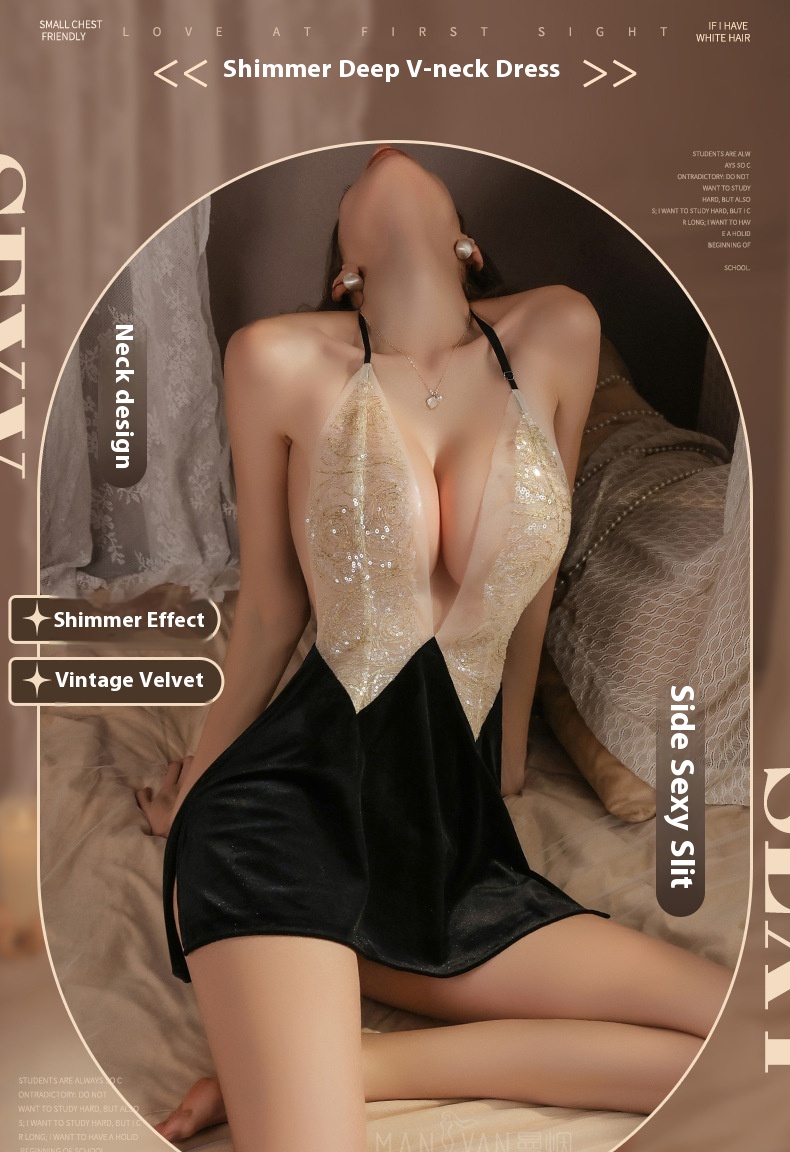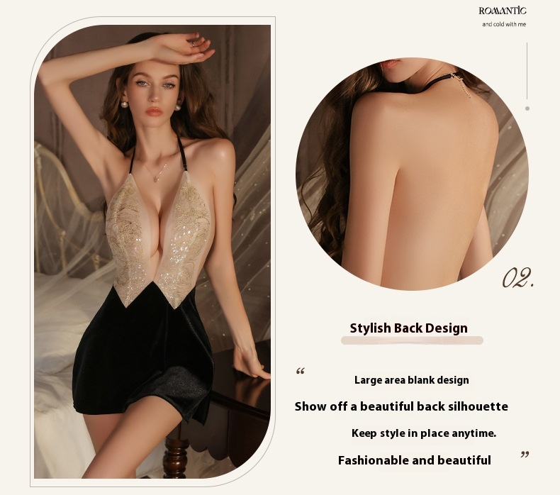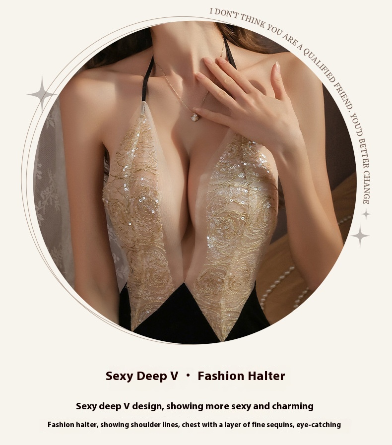 Be the first to review “Sexy Man Sexy Lingerie Hanging Neck Slit Beautiful Back Flash Nightclub Deep Five Pack Hip Skirt” Cancel reply