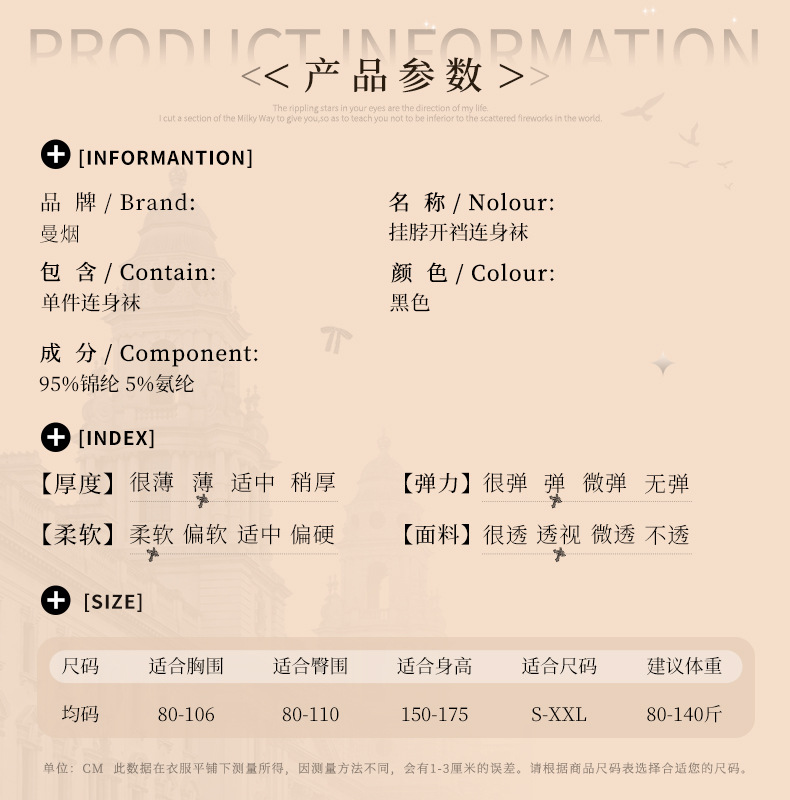 成为第一个“曼烟情趣内衣女性感镂空透视交叉挂脖连身袜开档修身网衣制服7173” 的评价者