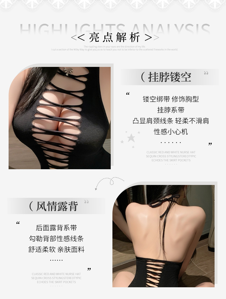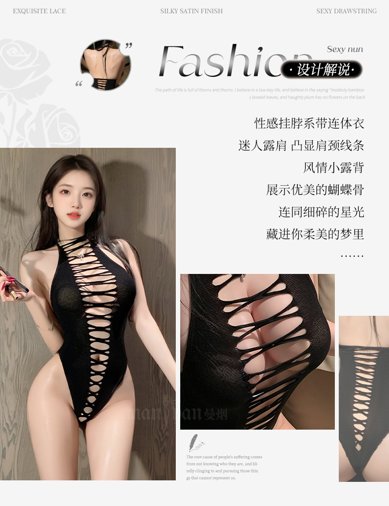曼烟情趣内衣女镂空连体衣性感挂脖系带连身袜美背网衣制服7074