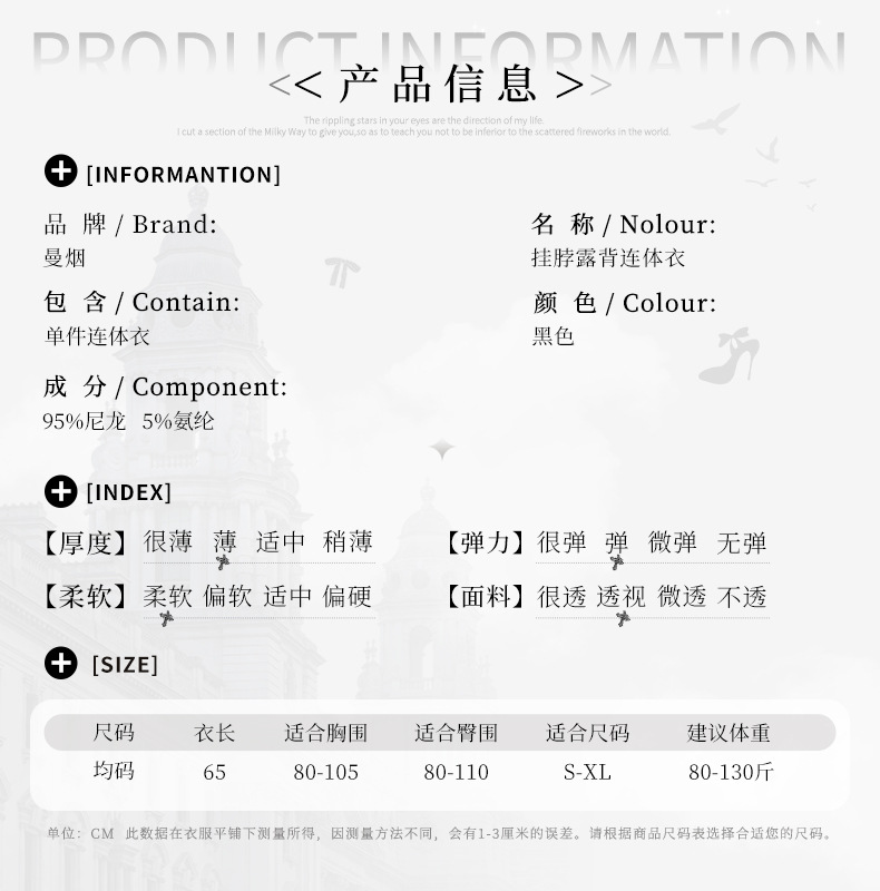 成为第一个“曼烟情趣内衣女镂空连体衣性感挂脖系带连身袜美背网衣制服7074” 的评价者