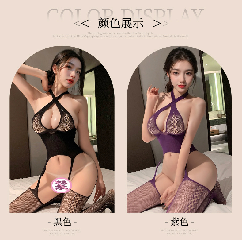 曼烟情趣内衣性感修身透视镂空流线挂脖美背开档连身网袜7418 数量