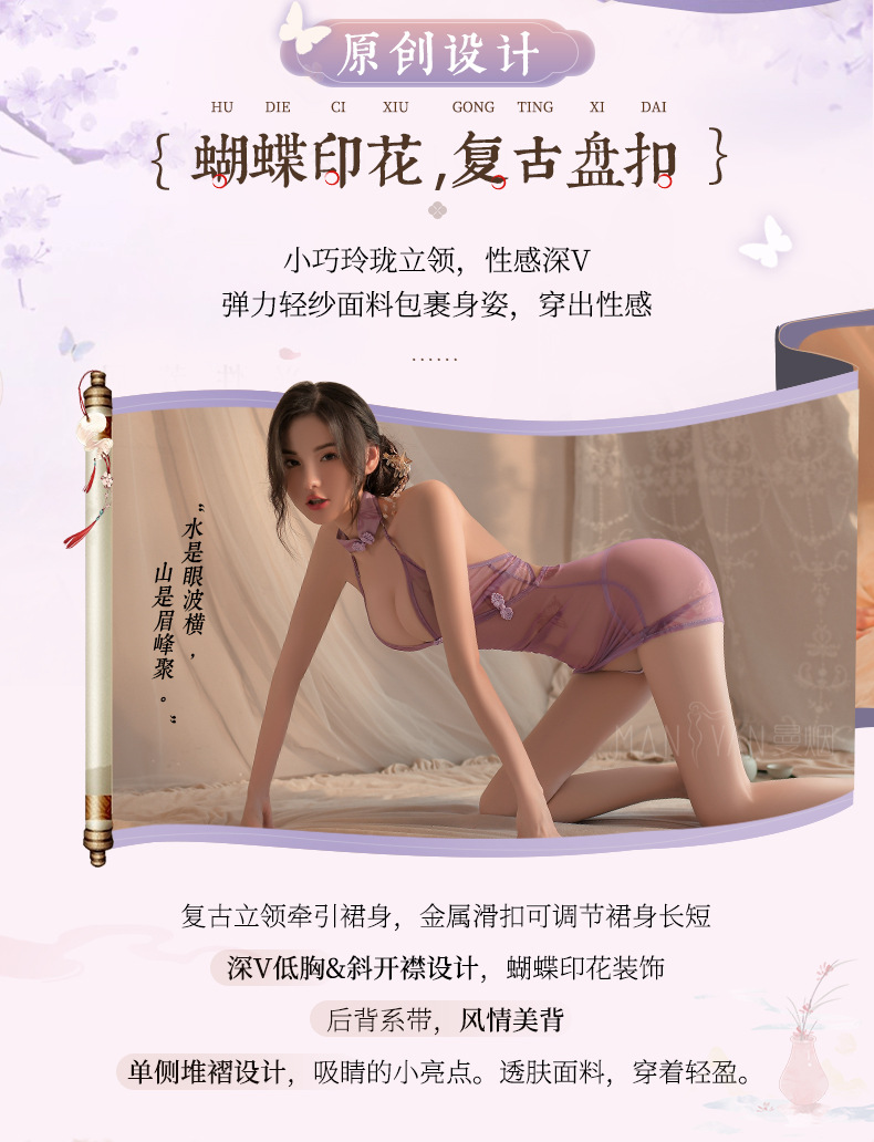 成为第一个“曼烟情趣内衣性感古风蝶恋花透视旗袍包臀绑带制服套装9175” 的评价者