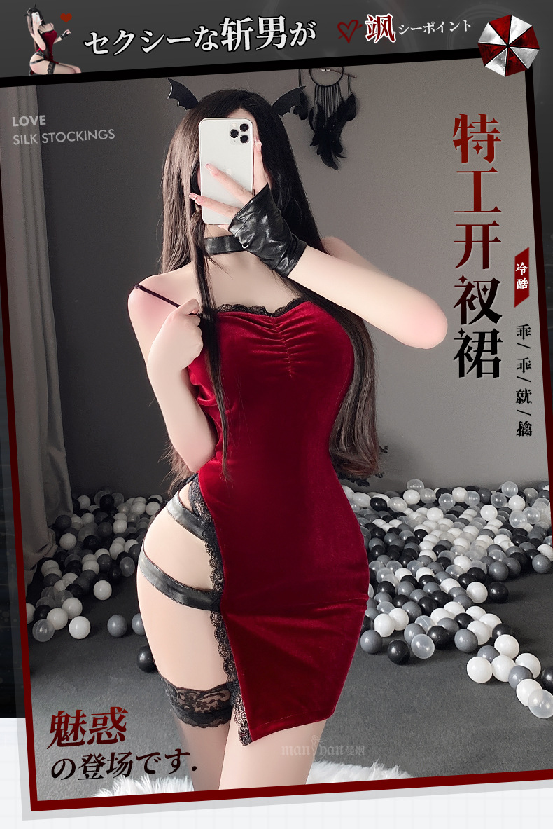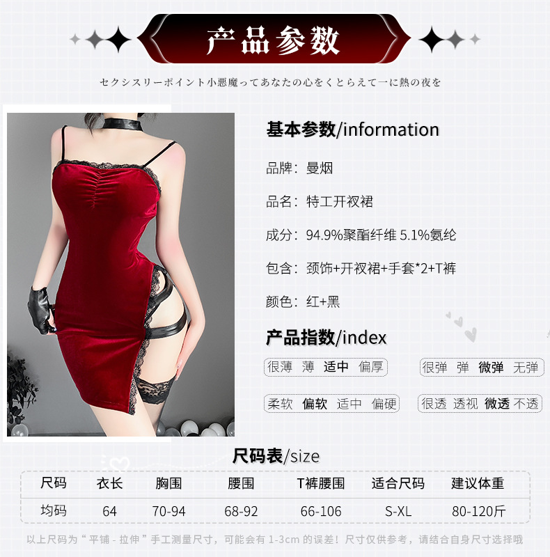 曼烟情趣内衣性感吊带特工高腰漆皮开叉镂空旗袍制服套装代发8522 数量