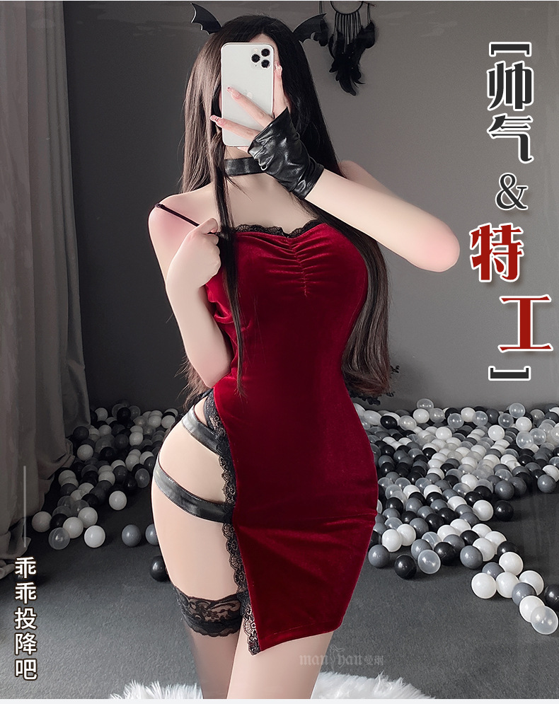 曼烟情趣内衣性感吊带特工高腰漆皮开叉镂空旗袍制服套装代发8522