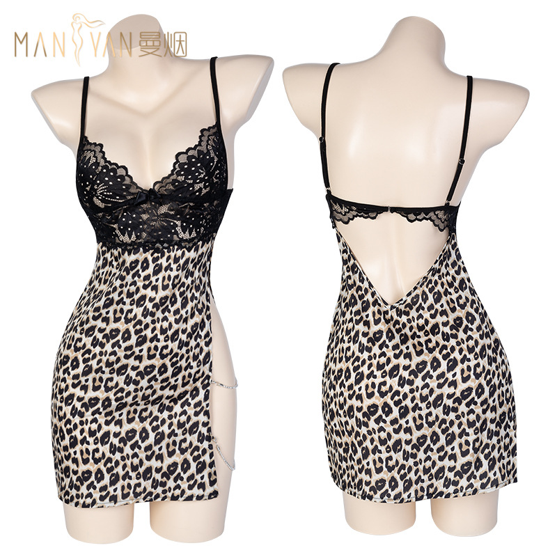 曼烟情趣内衣性感吊带蕾丝花边高腰开叉豹纹睡裙制服套装9688