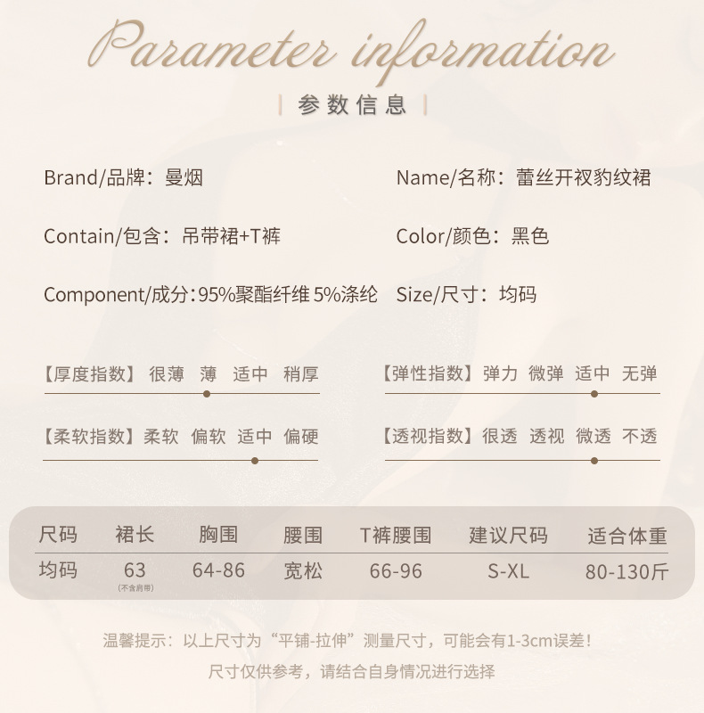 成为第一个“曼烟情趣内衣性感吊带蕾丝花边高腰开叉豹纹睡裙制服套装9688” 的评价者