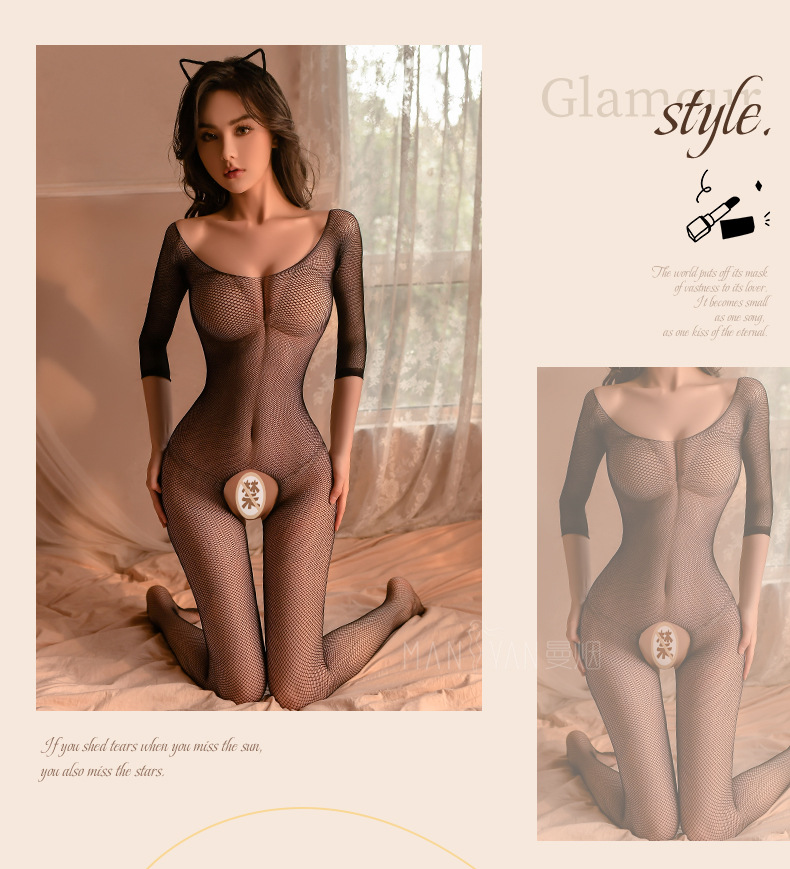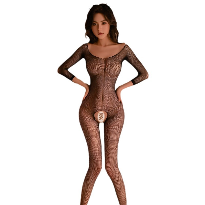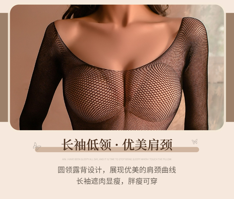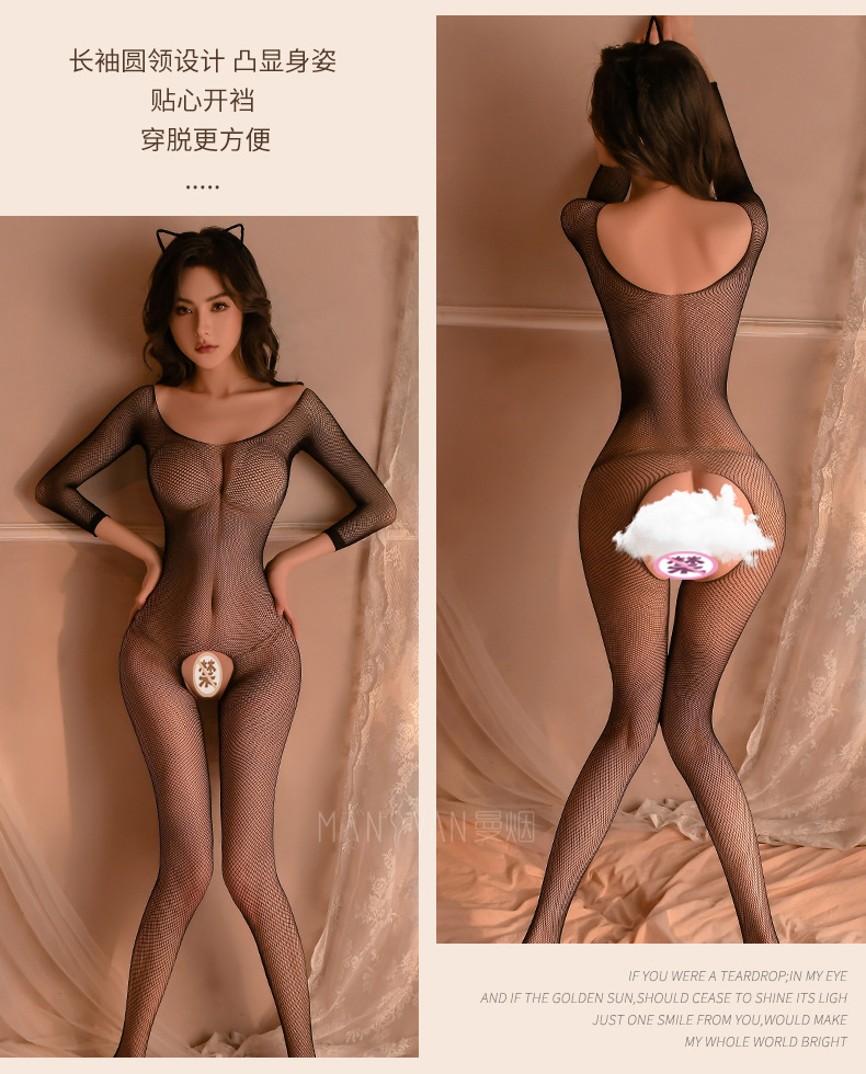 曼烟情趣内衣性感圆领长袖露背网眼透视开档连身袜情趣丝袜7910