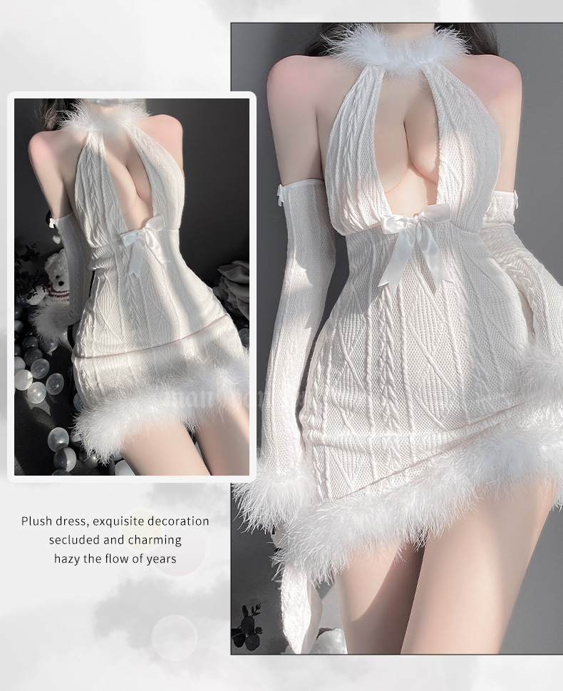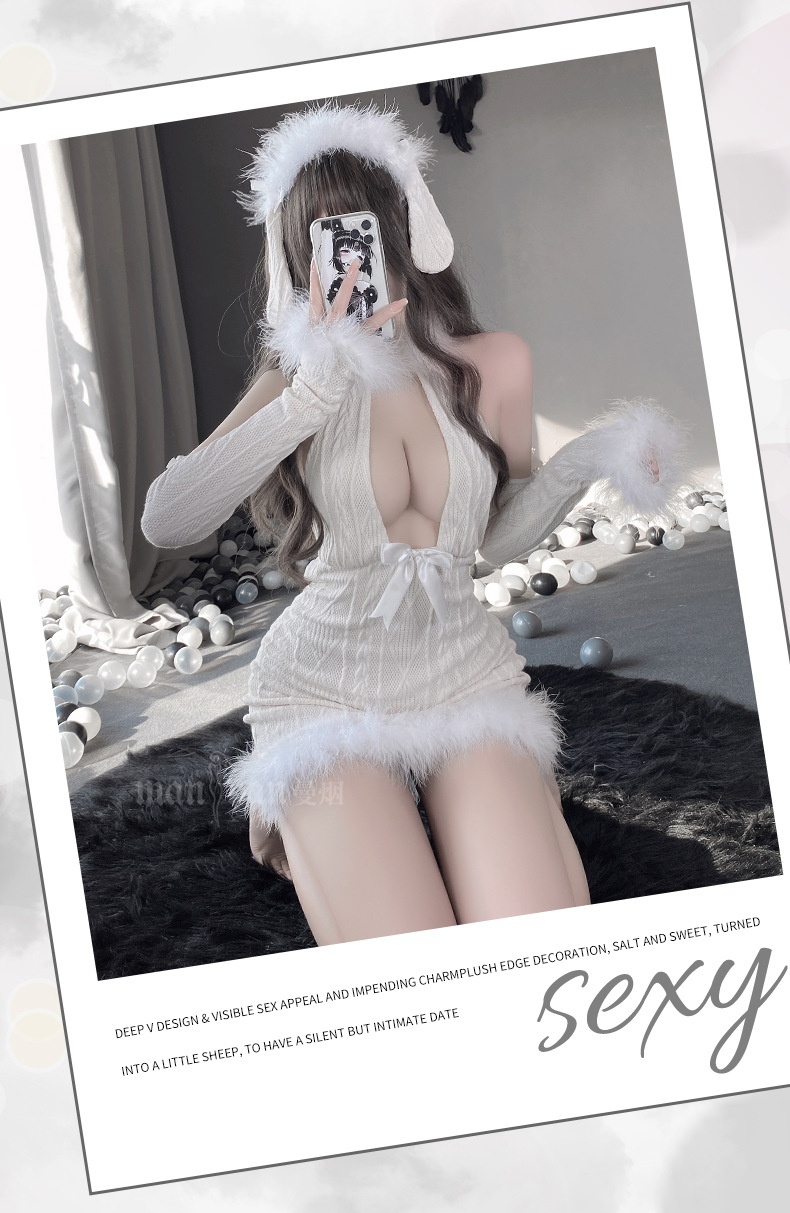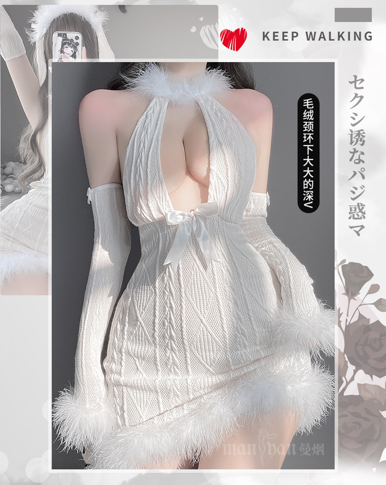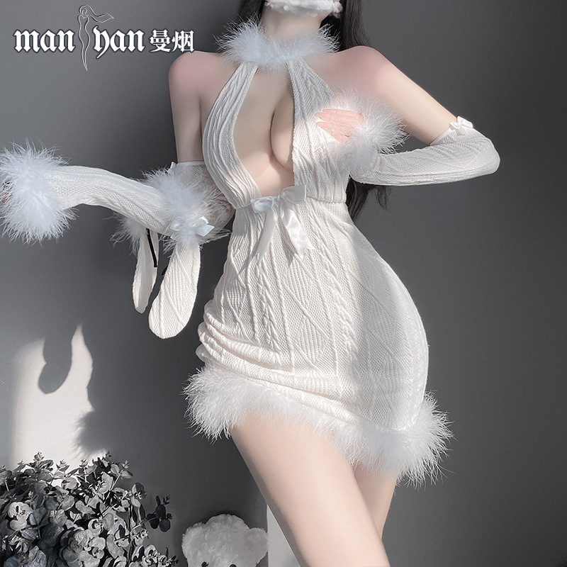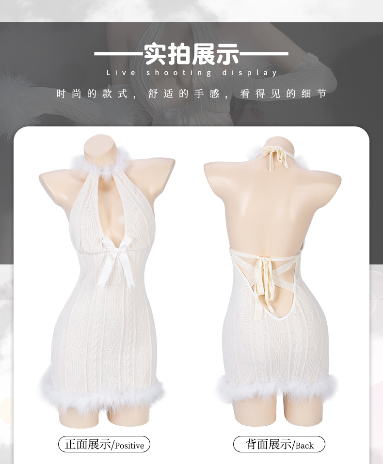 曼烟情趣内衣性感挂脖深v毛绒绑带绵羊连衣裙制服套装代发9753
