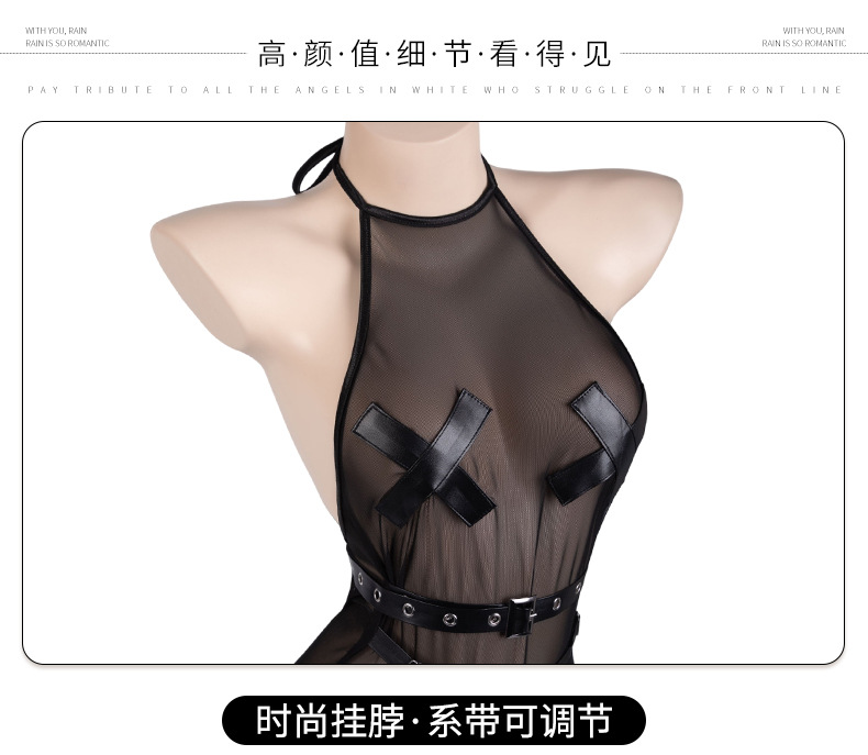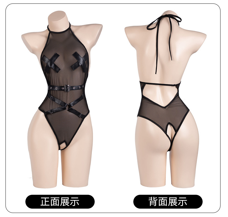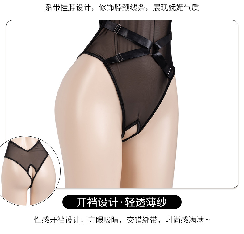 曼烟情趣内衣性感挂脖系带美背时尚柔纱透视开裆连体衣9096