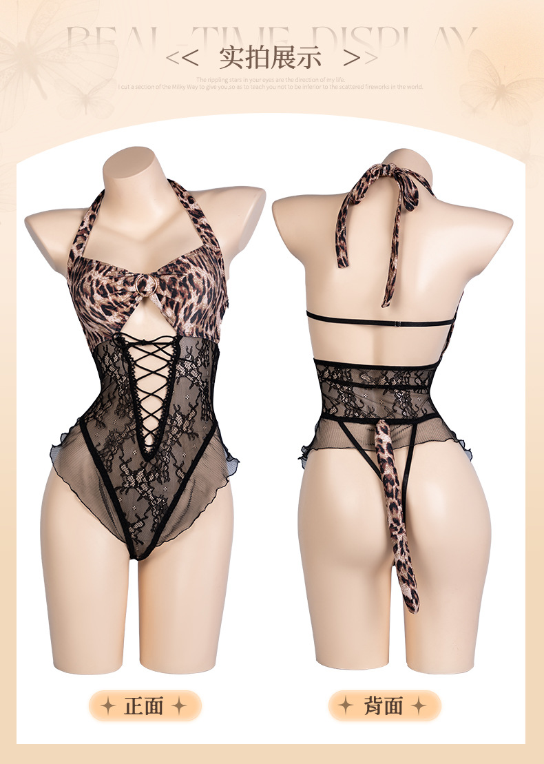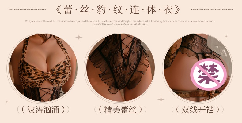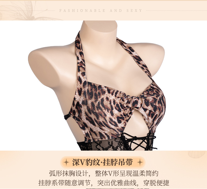 曼烟情趣内衣性感挂脖花边蕾丝系带透视露背豹纹开档连体衣9282