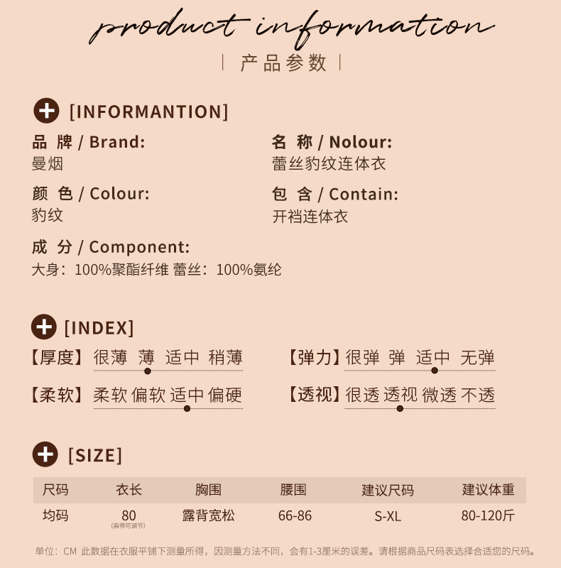 成为第一个“曼烟情趣内衣性感挂脖花边蕾丝系带透视露背豹纹开档连体衣9282” 的评价者
