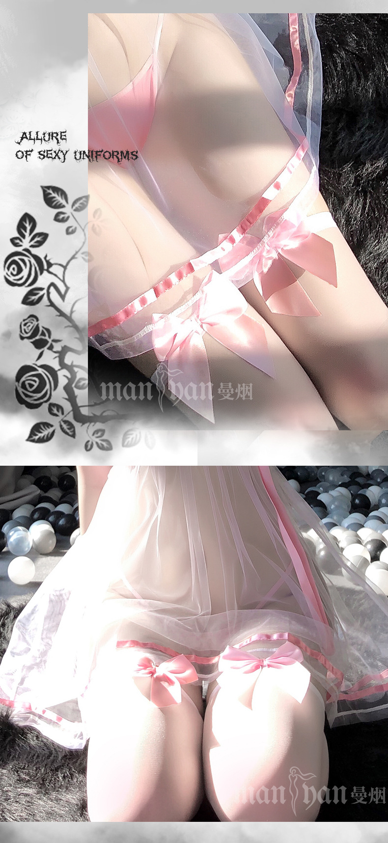 曼烟情趣内衣性感蝴蝶结宽边透视美腿袜长筒袜情趣丝袜7122