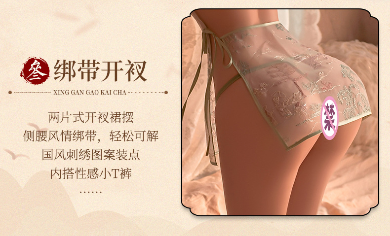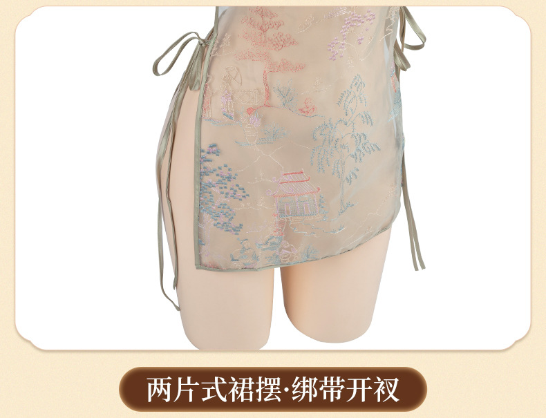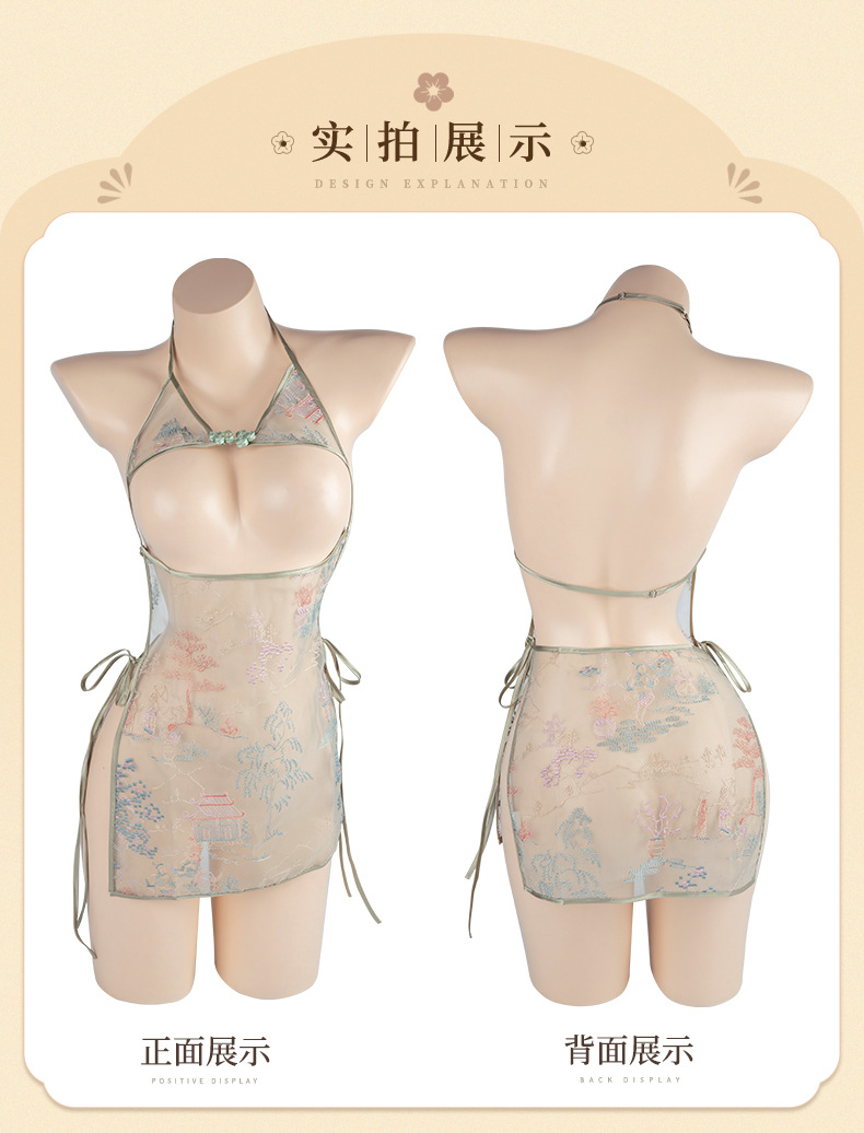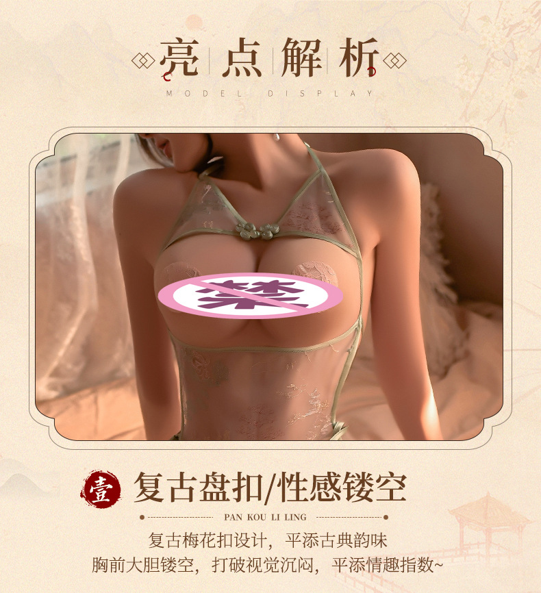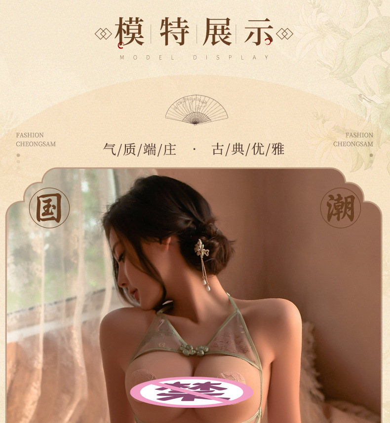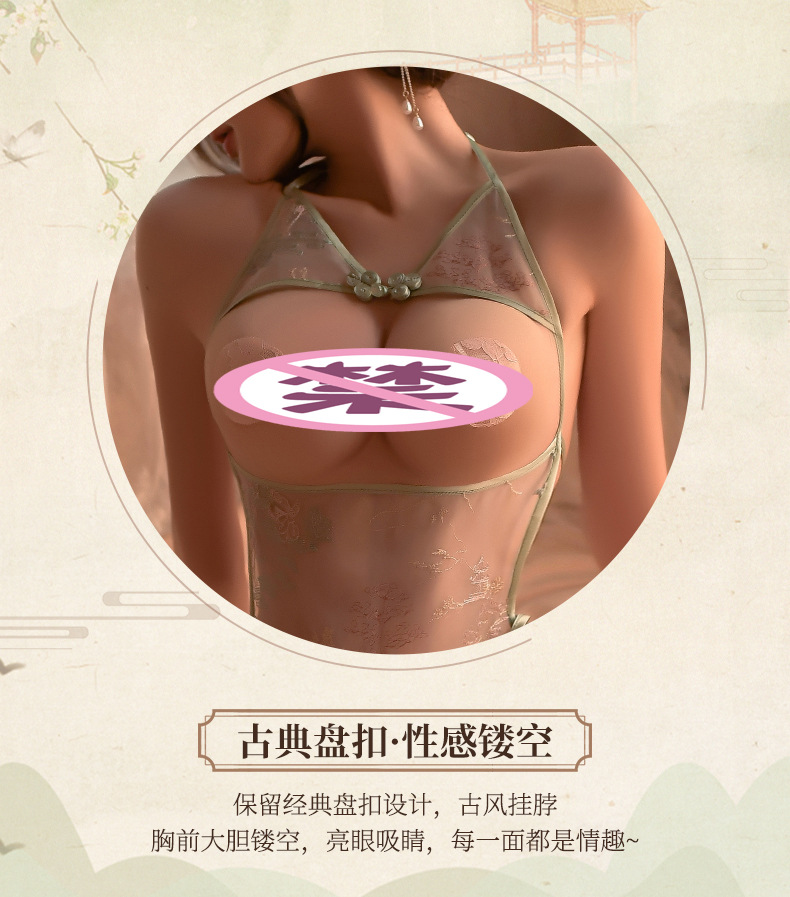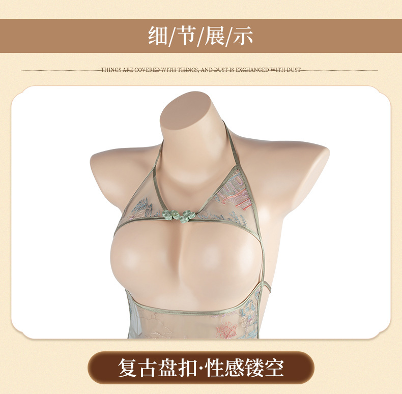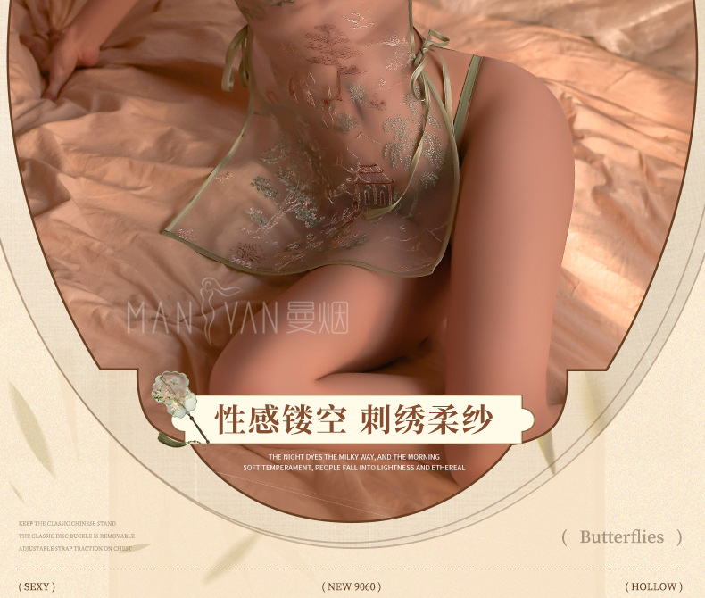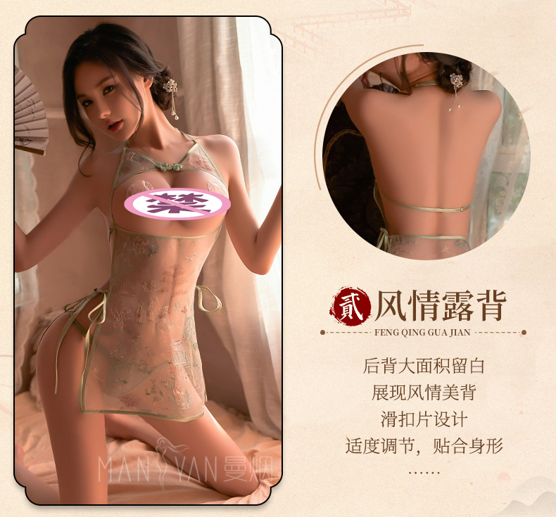 曼烟情趣内衣性感镂空挂脖刺绣透视绑带露背复古盘扣旗袍套装9060