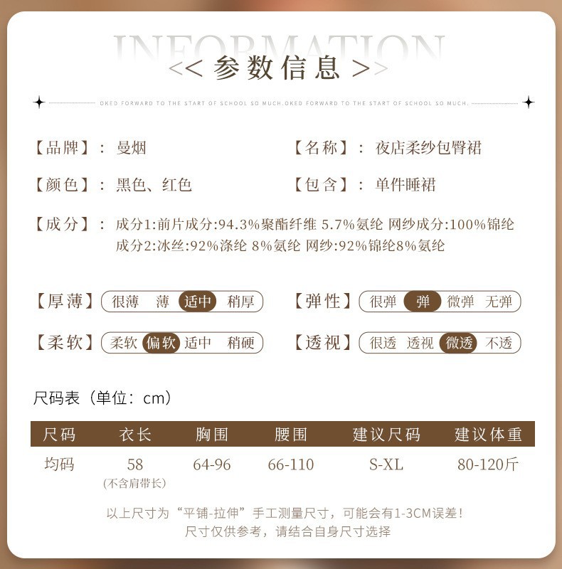 成为第一个“曼烟钢托聚拢包臀裙性感柔纱透视吊带睡裙褶皱睡衣女情趣内衣9400” 的评价者