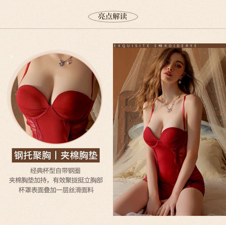 曼烟钢托聚拢包臀裙性感柔纱透视吊带睡裙褶皱睡衣女情趣内衣9400